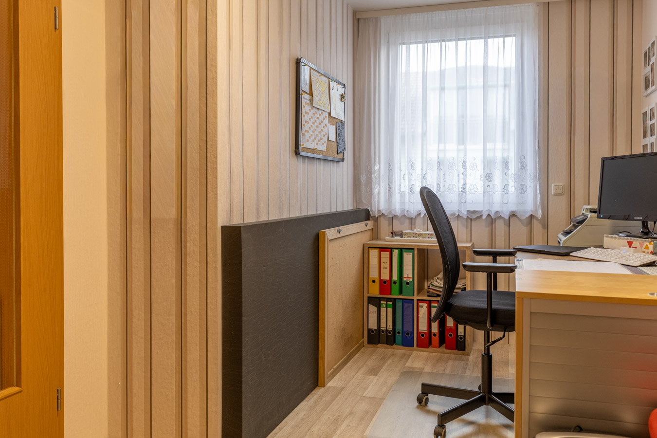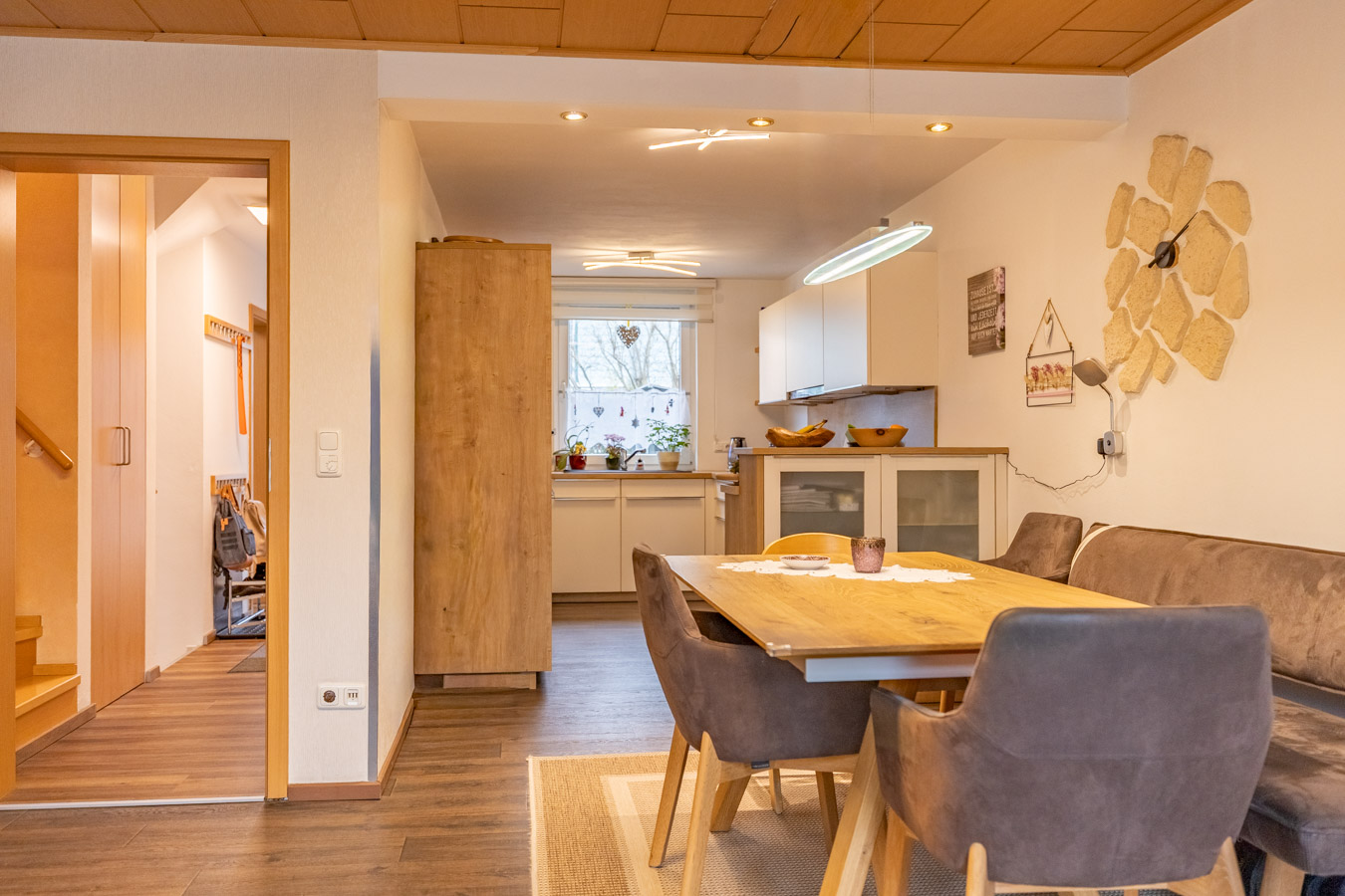 Sie betreten das Haus und werden von einem hellen und freundlichen, zur Küche offenen Wohnbereich empfangen, der durch große Fenster mit Tageslicht gefüllt ist. Die großzügige Einbauküche ist perfekt für kulinarische Genüsse. Ein Gäste-WC im Erdgeschoss rundet das Raumangebot ab. Auf den oberen Etagen finden Sie insgesamt vier gemütliche Schlafzimmer sowie ein Badezimmer mit Fenster. Das gut und ruhig gelegene Haus ist ideal für Familien und Home-Office.