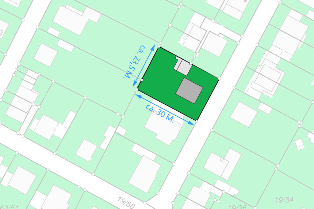 Die voraussichtlich mögliche GFZ liegt bei 0,75 bis 0,85 orientiert man sich an der Bebauung der Umgebung. Entsprechend ist auch hier eine Genehmigungsfähigkeit in diesem Rahmen wahrscheinlich. Zwei verbindliche Baugrenzen wurden von der Lokalbaukommission bereits festgelegt, was Ihnen Planungssicherheit gibt.